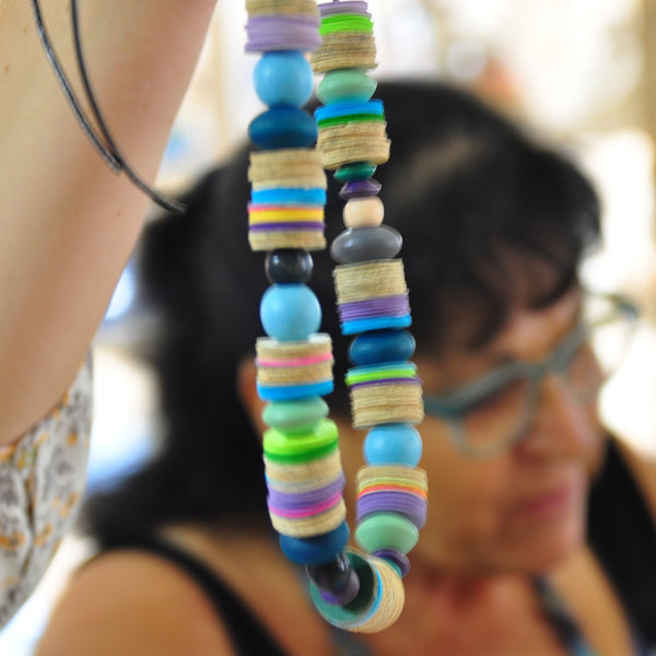 Hedva Klein collects old books whose pages are yellowing and turns them into artistic jewelry, adding colored paper or wooden beads. She is part of the ART 192 Gallery, a collective of 10 women artists from the Galilee.